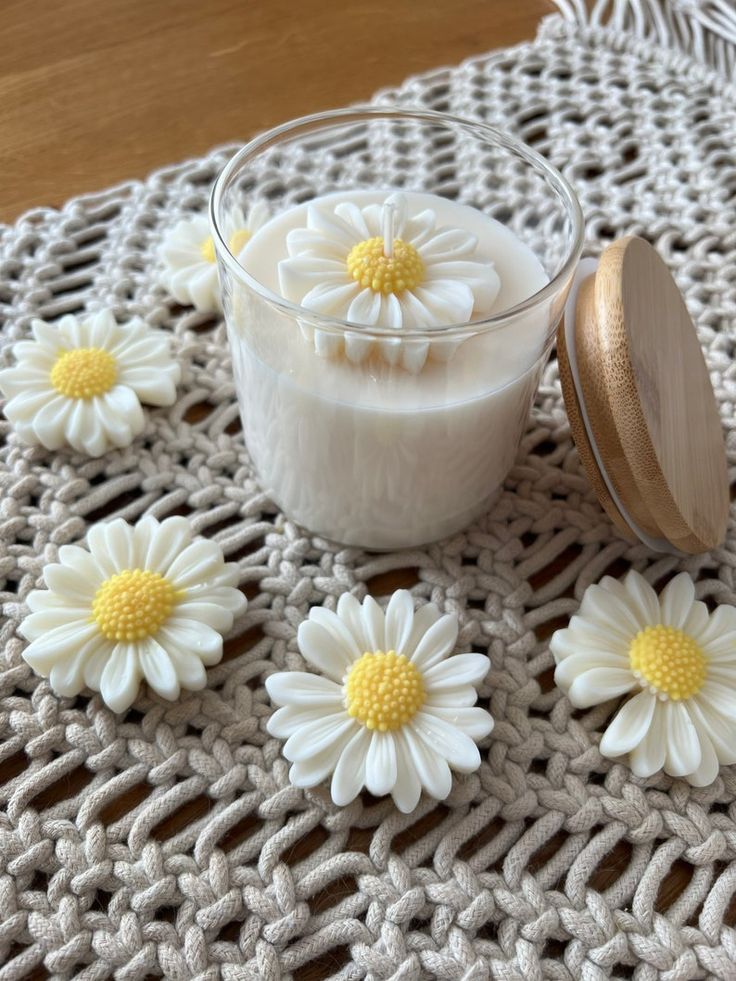 This handcrafted daisy flower jar candle is a flawless combination of both beauty and warmth. Designed in a clear glass jar, this scented candle has a meticulously handcrafted daisy flower design on top of it, making it look elegant even before it is lighted.
