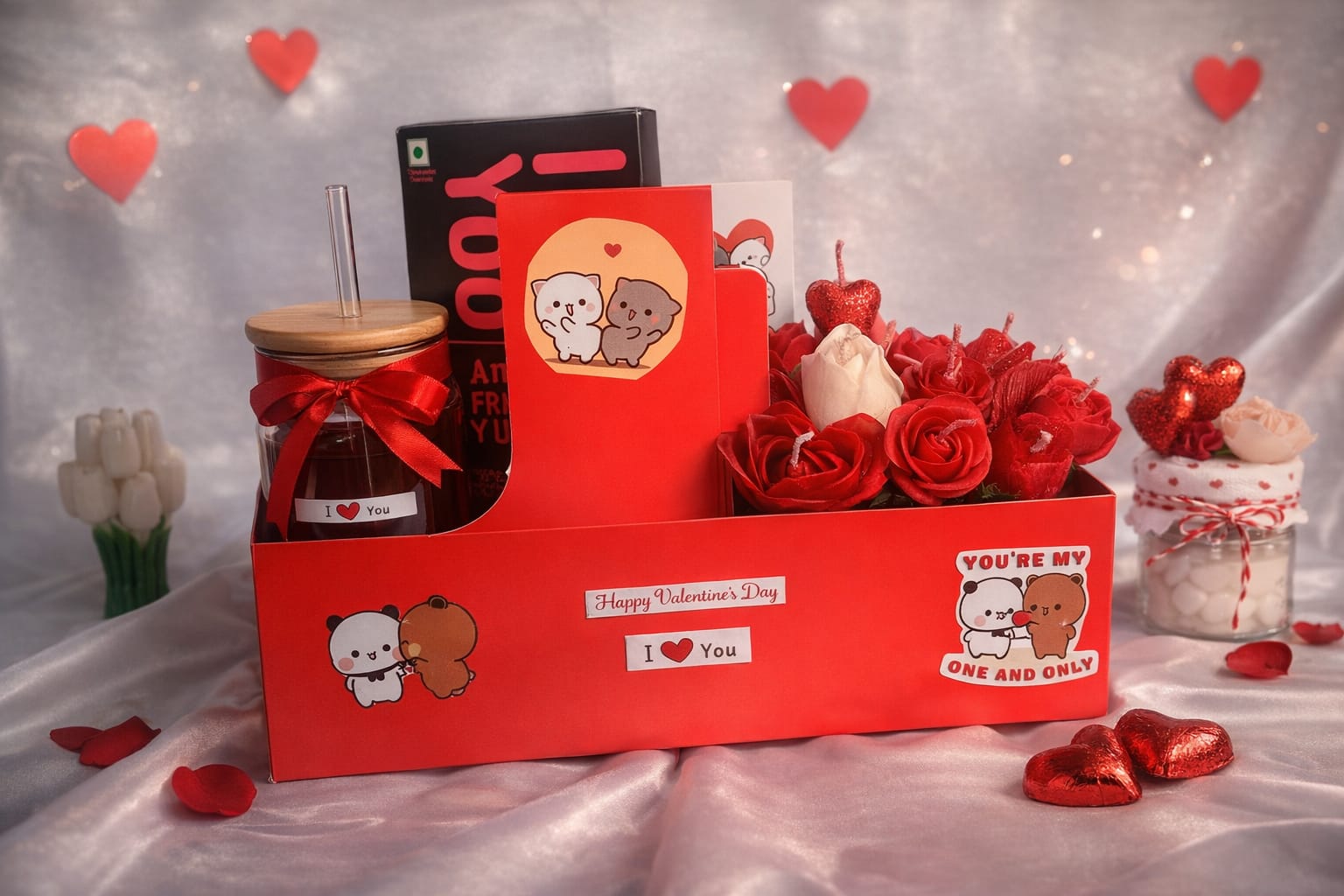 The hamper includes a romantic rose candle bouquet, an elegant glass sipper with wooden lid, Amul I Love You chocolate, a cute I Love You mug, a stylish adjustable ring, and a heart-shaped tin box filled with artificial roses and a teddy, making it a complete Valentine gift set.